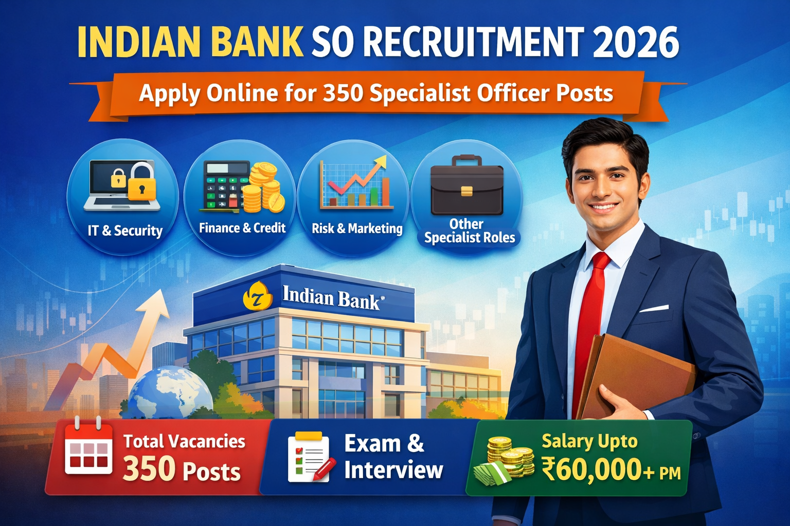 The Indian Bank SO Recruitment 2026 notification has been released for 350 Specialist Officer (SO) vacancies across various departments. This recruitment is a great opportunity for candidates looking to build a career in the banking sector with specialized roles such as IT, Finance, Risk, and Marketing.