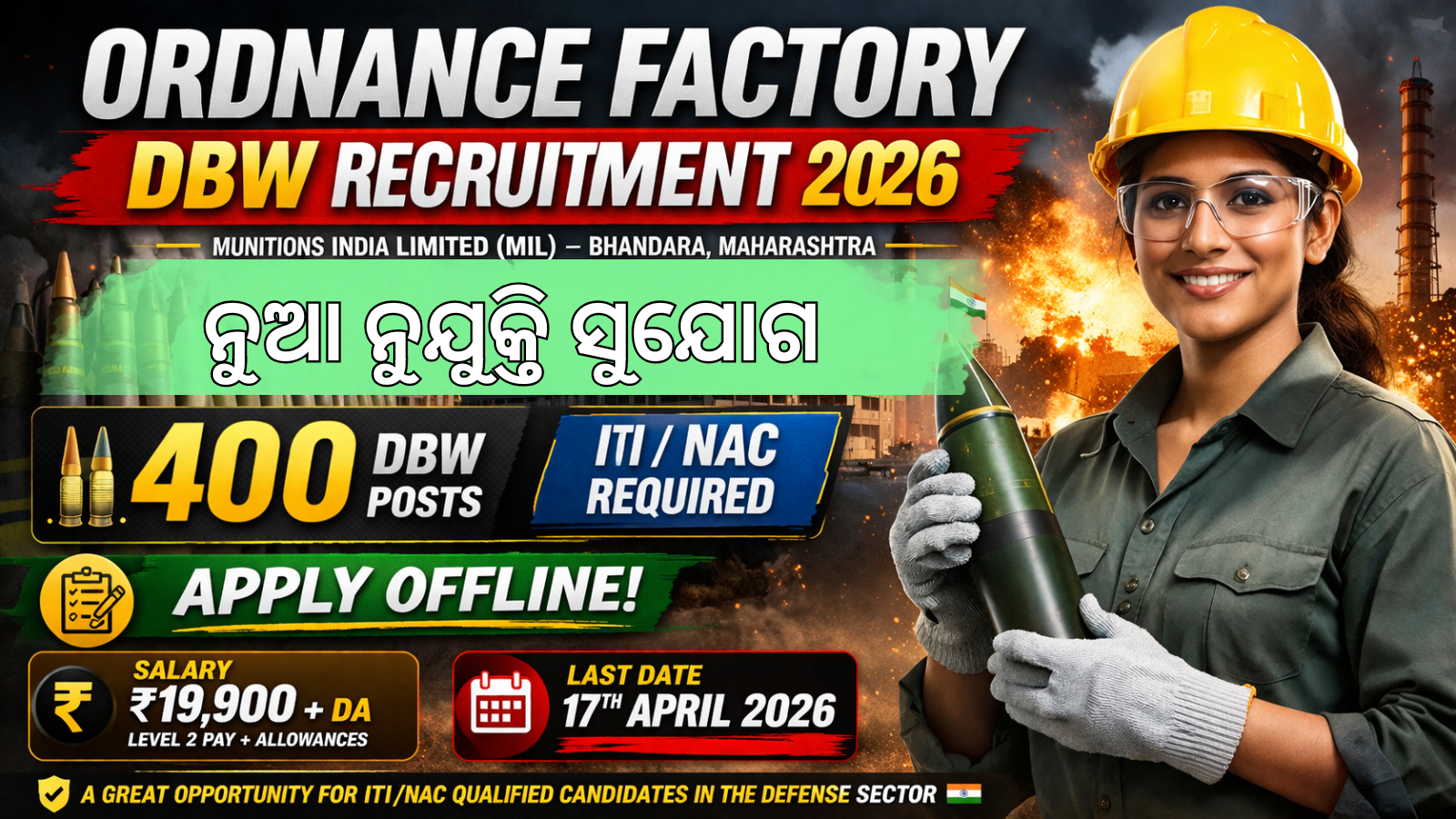 The Ordnance Factory Recruitment 2026 notification has been officially released for 400 Danger Building Worker (DBW) posts under Munitions India Limited (MIL). This is a great opportunity for ITI/NAC qualified candidates looking for government jobs in the defense manufacturing sector.